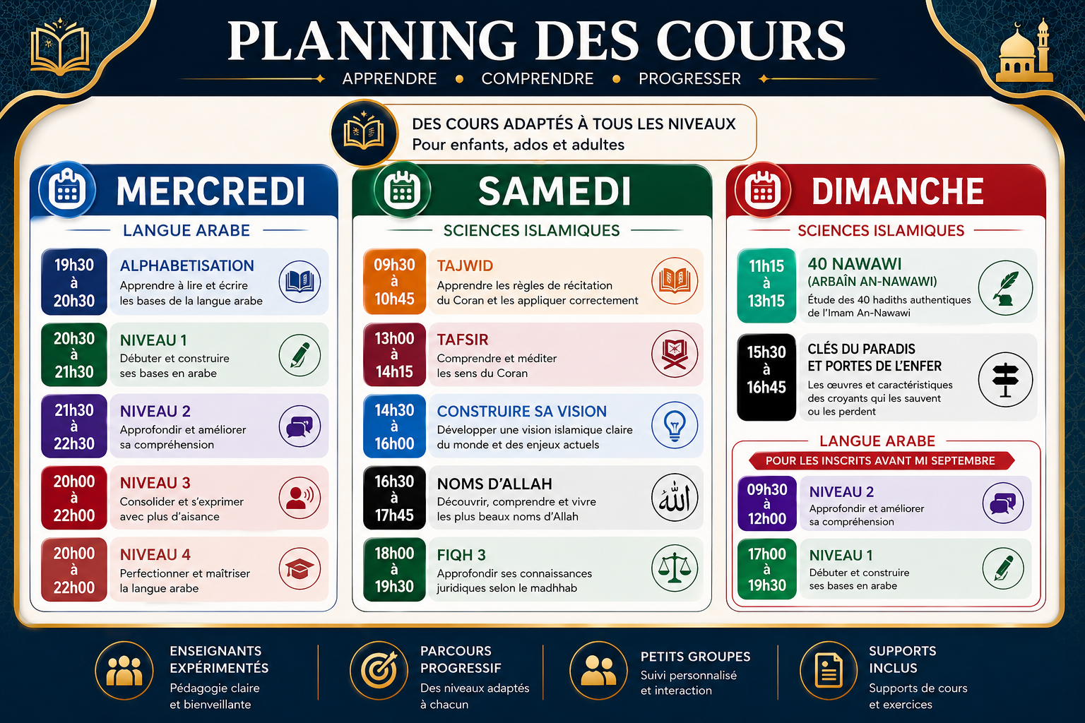 Les SAMEDIS et DIMANCHE sont pour les SCIENCES ISLAMIQUES.